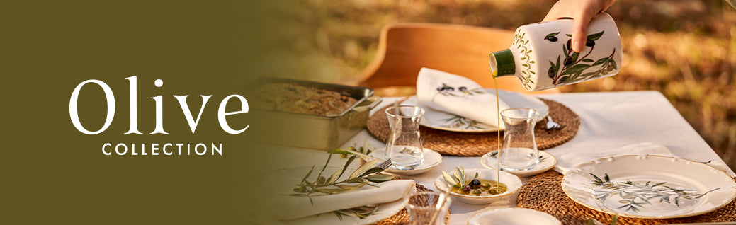 The Olive Collection celebrates the rustic elegance of the Mediterranean countryside, where olive branches symbolize peace, prosperity, and hospitality. Soft greens, natural textures, and artisan finishes create a table setting that feels both grounded and refined.