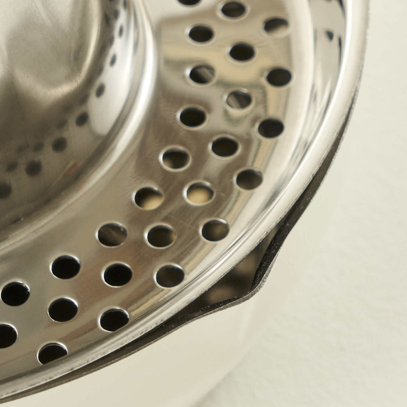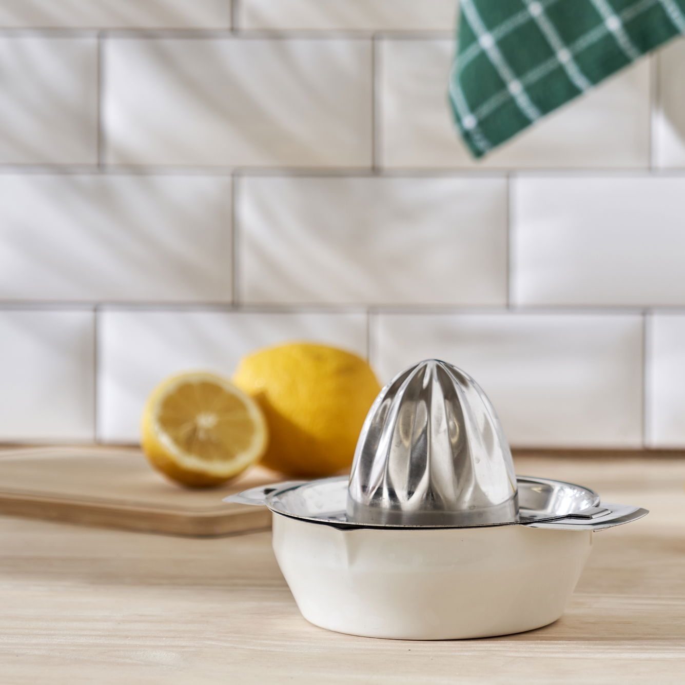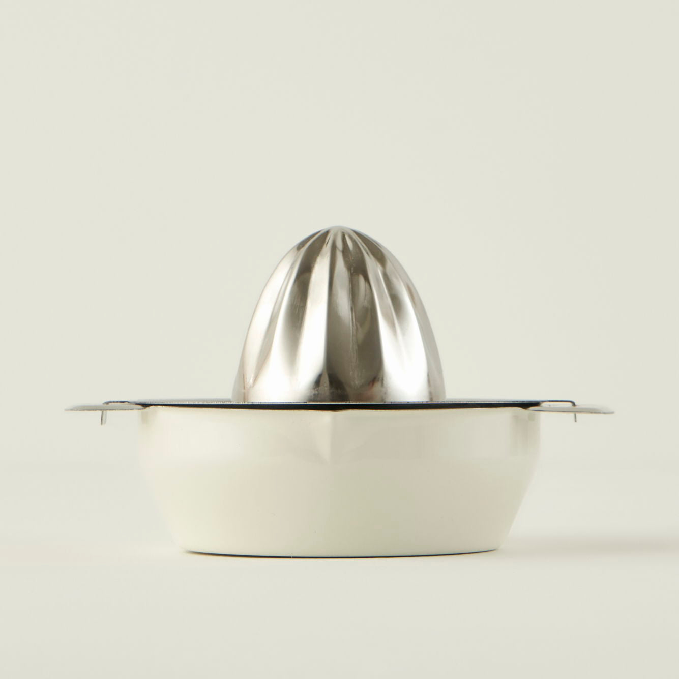 Stainless steel footed citrus juicer with a shiny white exterior and chrome interior, designed for durability and style.