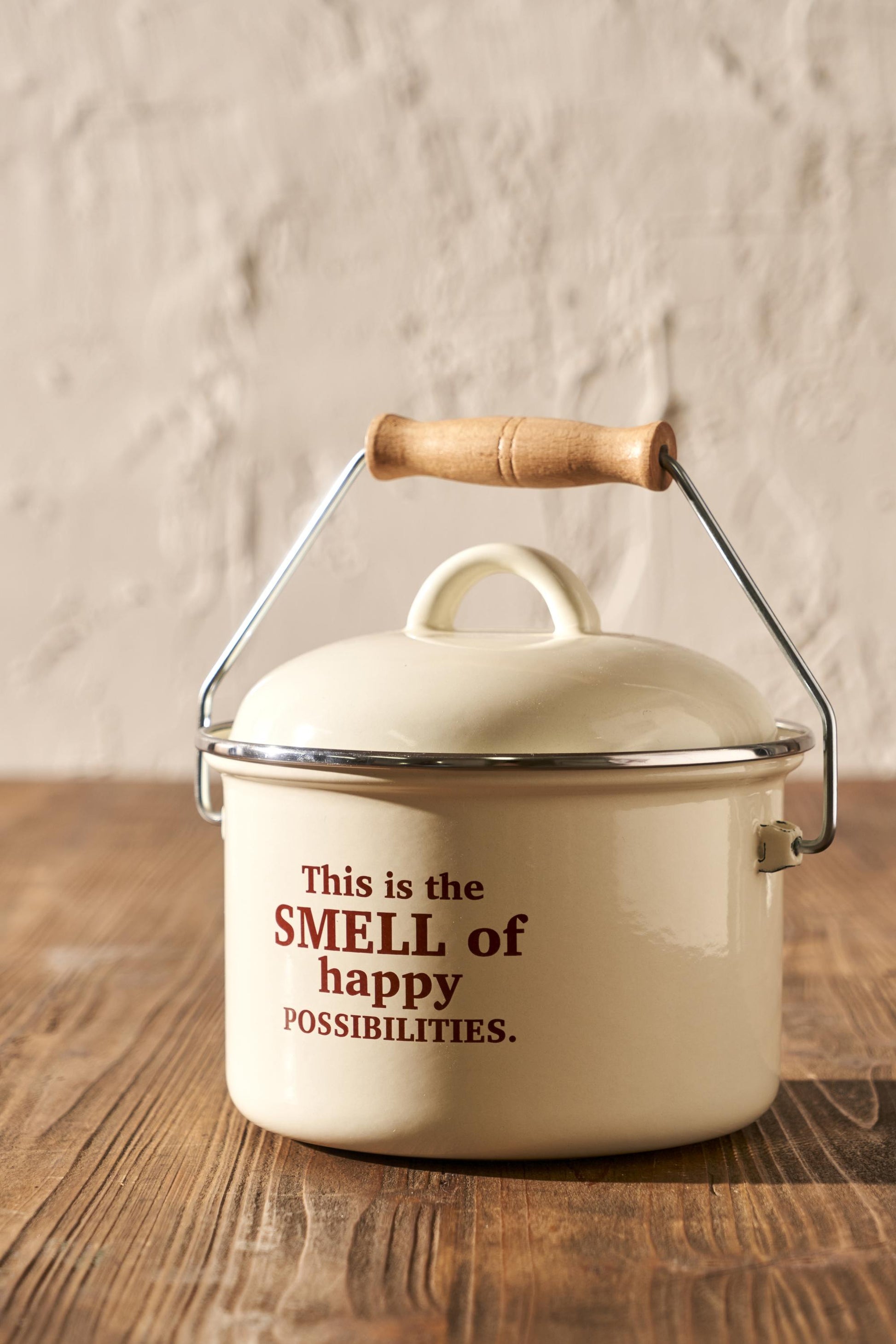 • Decorative enamel-coated pitcher featuring wooden handle details