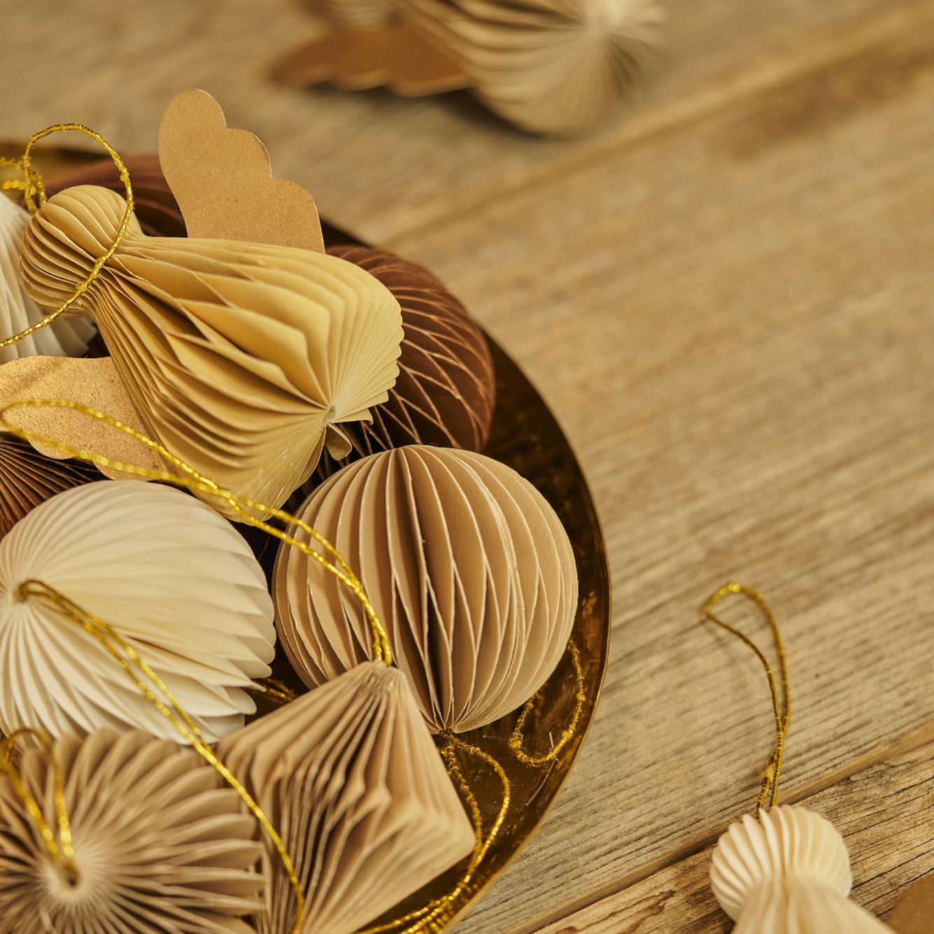 Decorate your tree with the Elio Paper Christmas Ornament Set, featuring nine handcrafted beige ornaments that bring natural texture and timeless charm to your holiday décor.