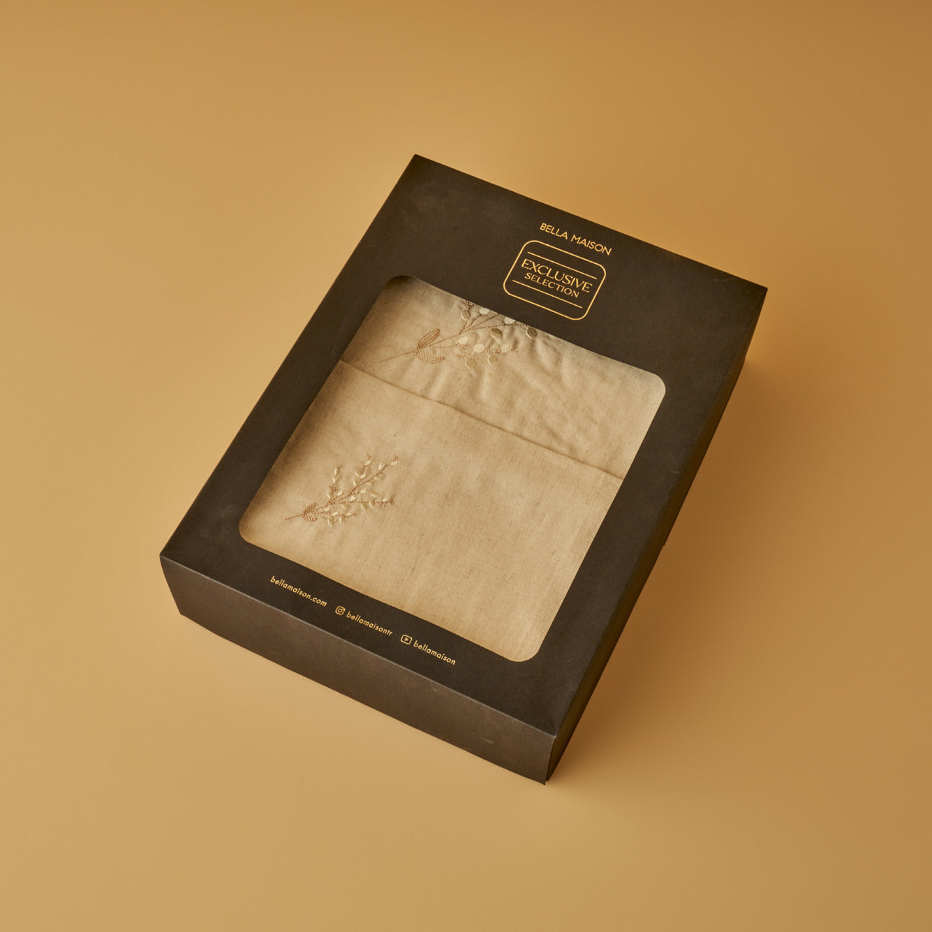 The Exclusive Linen 14-Piece Table Textile Set features elegant embroidery on linen, bringing refined style to your dining table.