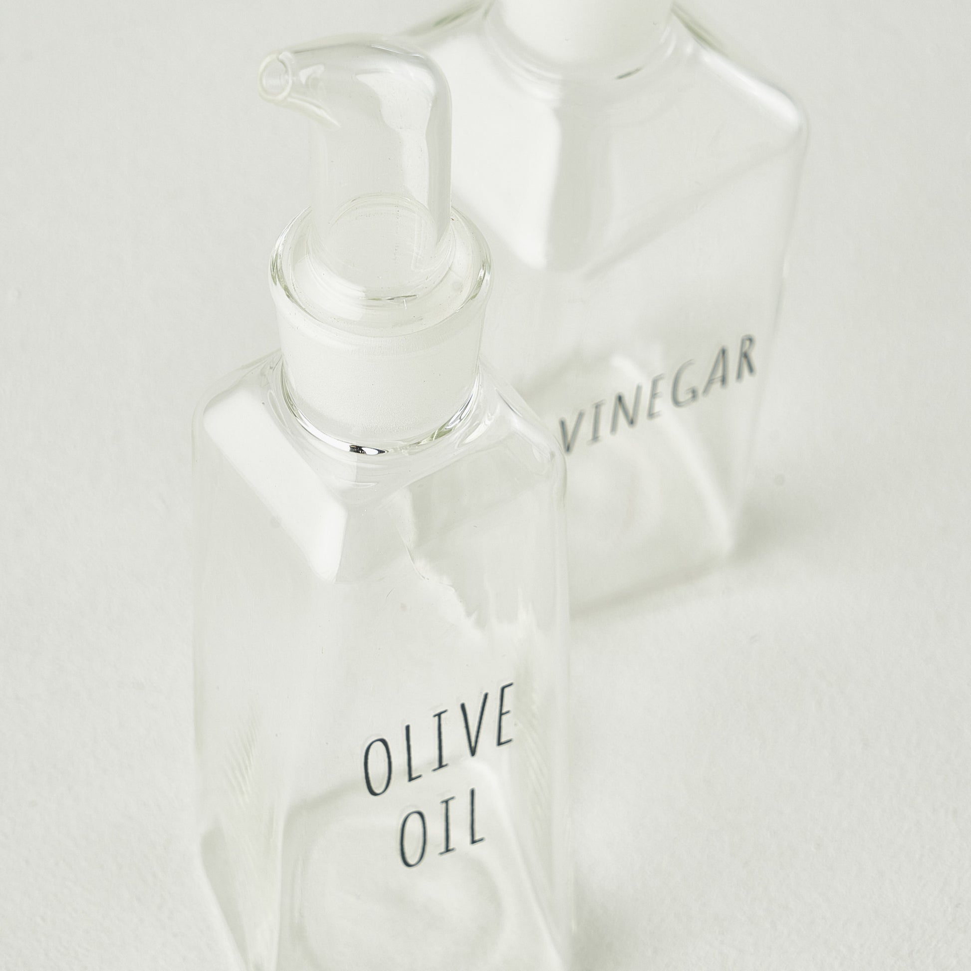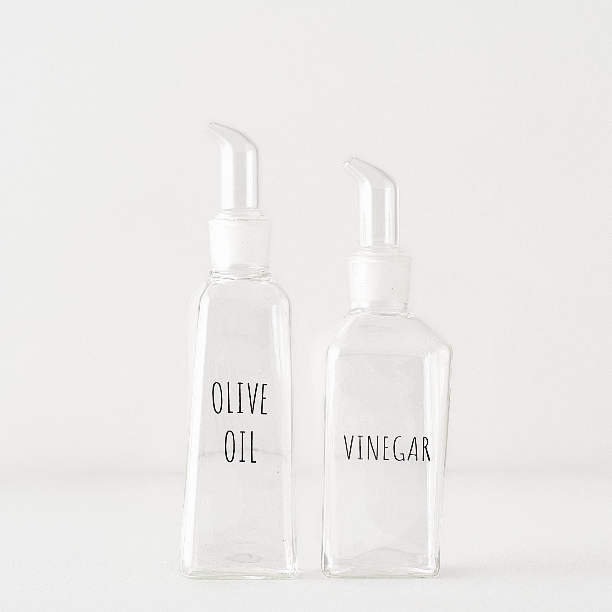 The Geo Oil & Vinegar Set is handcrafted from borosilicate glass using the blowing technique. Featuring geometric patterns and “Olive Oil” – “Vinegar” text, it adds a modern, elegant touch to your kitchen.