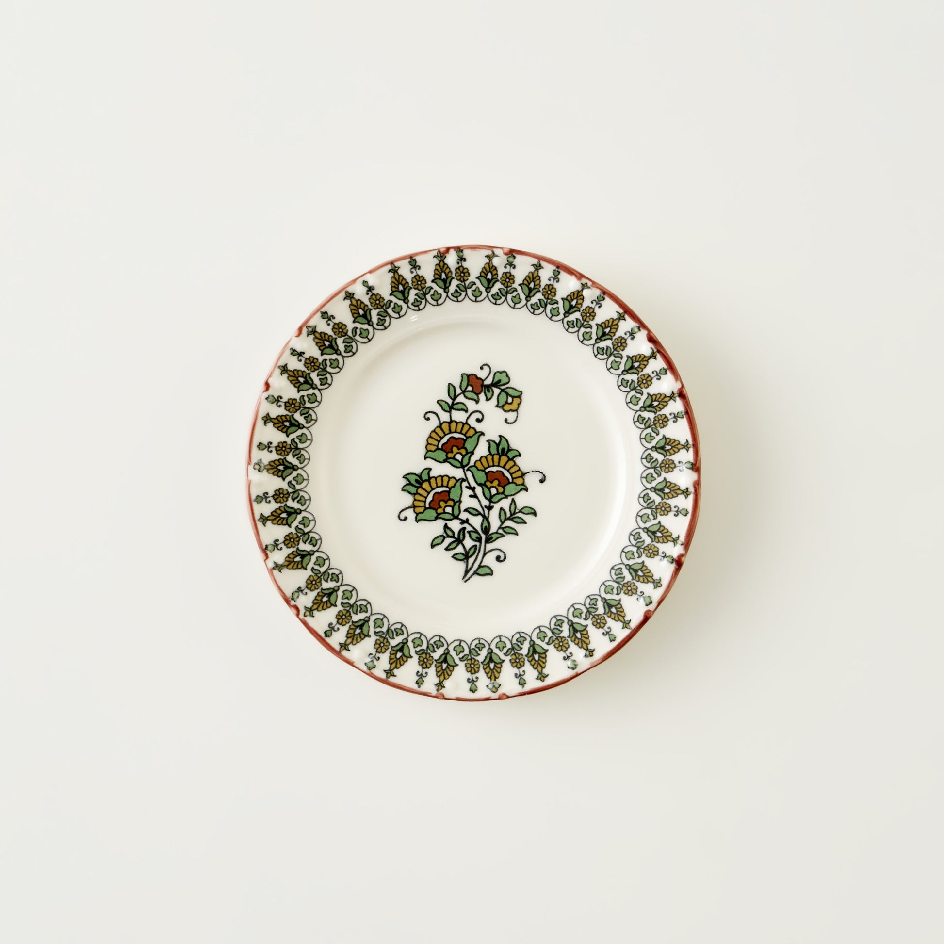 The Indian Dessert Plate features a porcelain design with a digital print and hand-painted rim, showcasing intricate mandala patterns and Mughal florals in warm, earthy tones inspired by India’s rich cultural heritage.