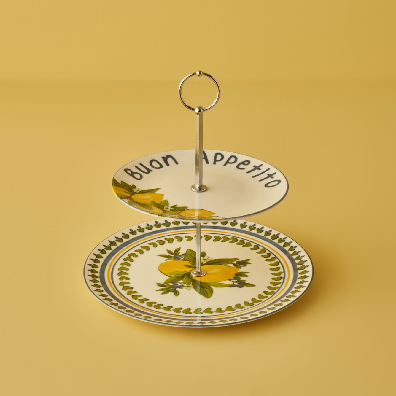 Two-tiered serving stand from the Lemoncello Collection bringing the freshness of lemon gardens and the elegance of the Amalfi Coast to your table.