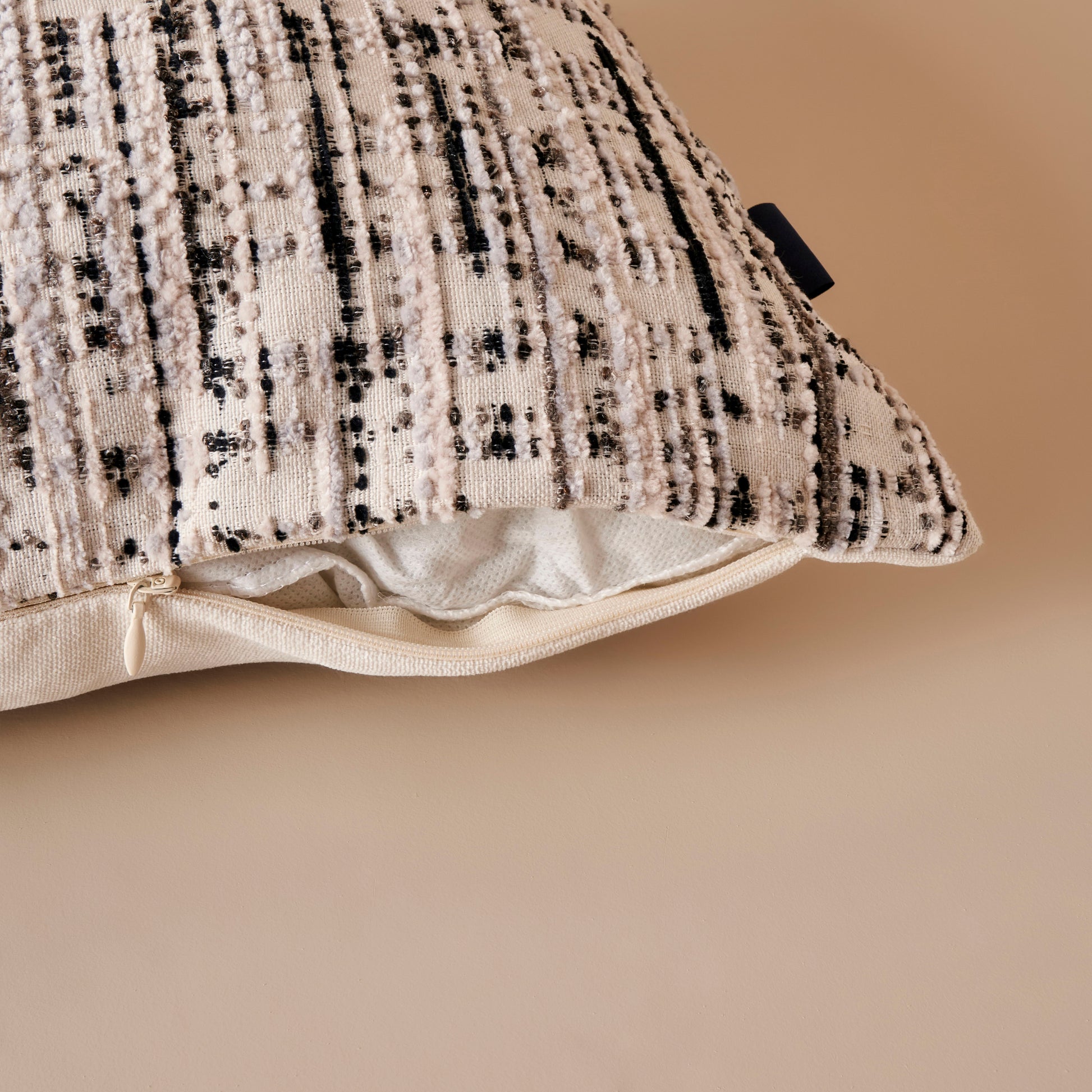 A modern black and white decorative pillow with hidden zipper and plush insert. Its 17" x 17" size makes it a stylish accent for sofas, chairs, or beds.