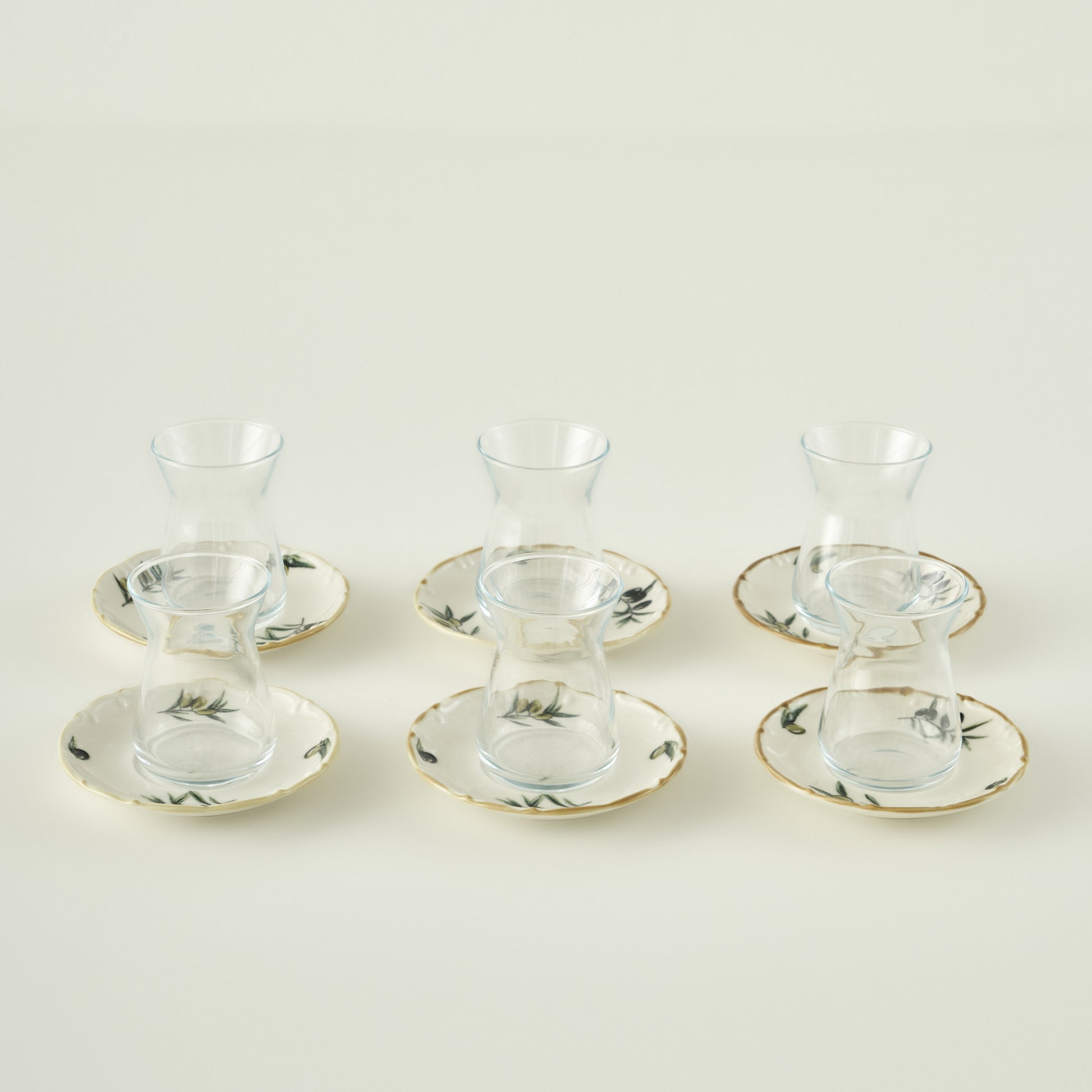 The Tea Glass Set with Saucers (6-Piece) features 6 clear glass tea cups paired with 6 porcelain saucers adorned with digital prints and hand-painted rims, inspired by the timeless elegance of olive trees. This collection brings natural simplicity and a deep-rooted cultural connection to your table.