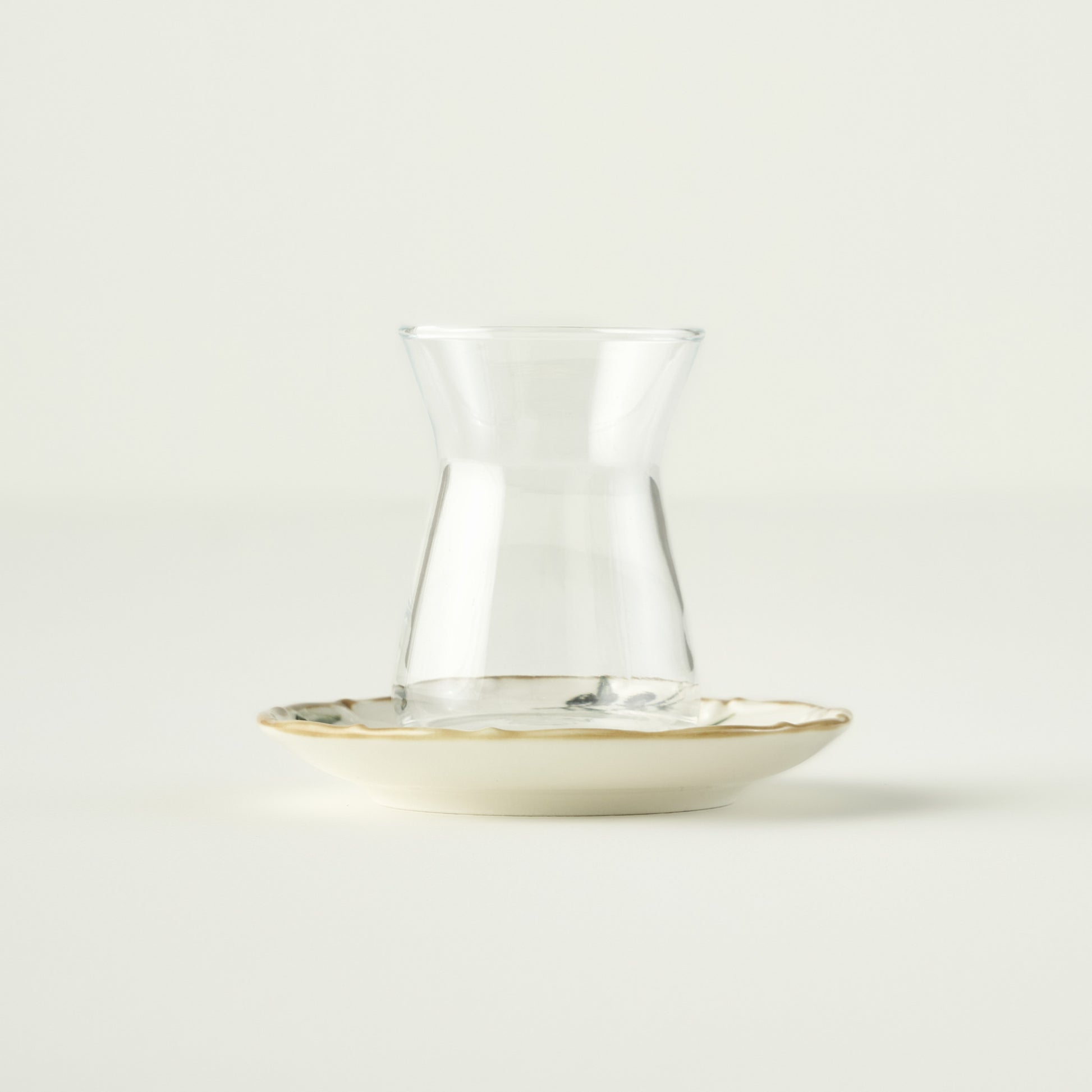 - Includes 6 clear glass tea cups and 6 porcelain saucers
