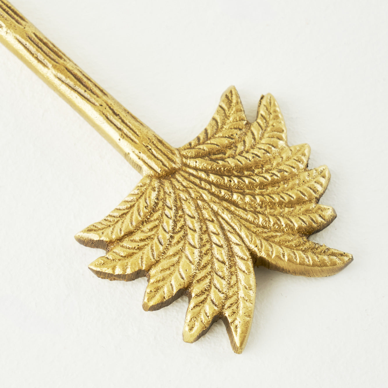 Cheese knife set with stainless steel blades and brass leaf-detailed handles for an elegant serving touch.