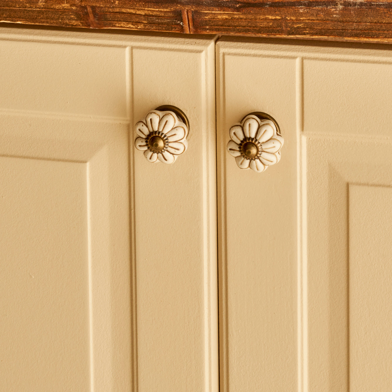 The Senna Cabinet Knob Set of 2 is crafted from ceramic and entirely handmade, giving each piece unique color variations and artisanal charm.