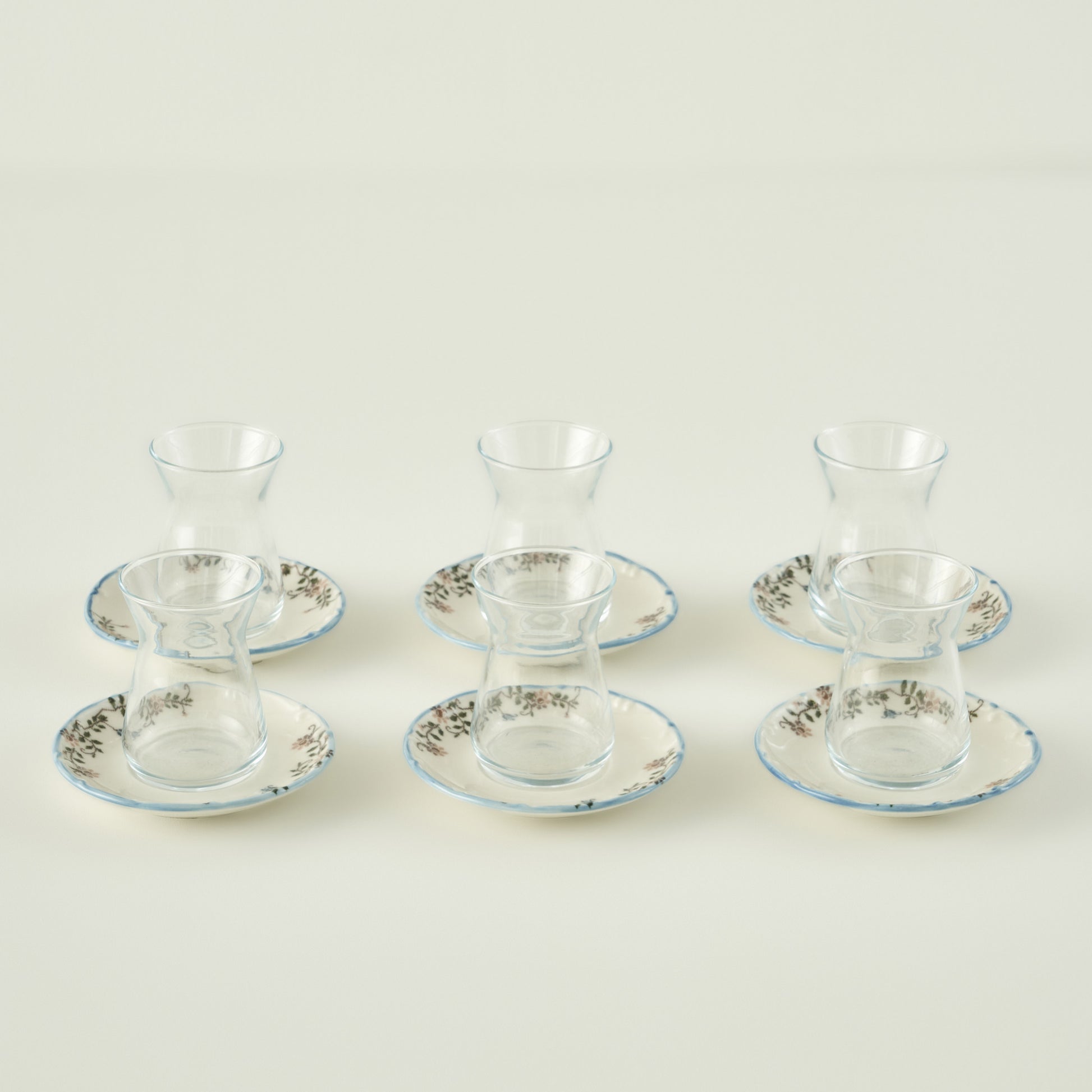Enjoy a charming tea experience with this Vintage Tea Glass Set with Saucers (6-Piece), featuring clear glass tea cups paired with porcelain saucers adorned with digital prints and hand-painted rims.